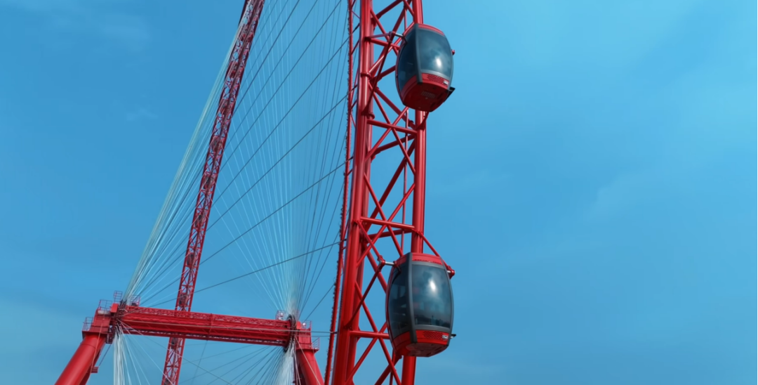 值得關(guān)注的是,金馬游樂在該項目上應用了兩項創(chuàng)新技術(shù)方案,確保摩天輪的舒適及安全。吊廂伺服調(diào)平技術(shù),令每個吊廂在運行中始終處于水平狀態(tài),大幅提升吊掛式轎廂受到風載荷時的平穩(wěn)性;雙驅(qū)動系統(tǒng)獨立運作方案,增強安全冗余,緊急狀況下無高空救援風險。