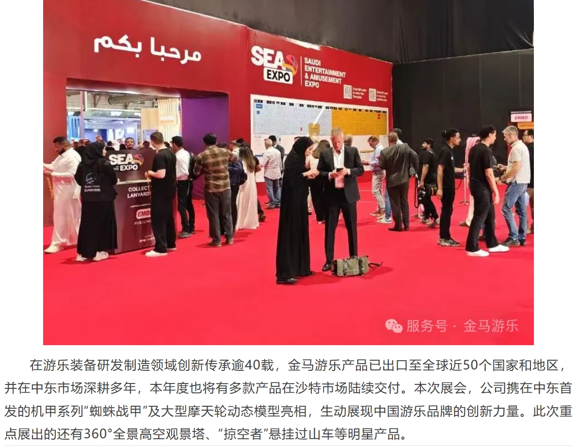5月20日,全球游樂行業(yè)焦點(diǎn)之一的2025 SEA沙特展在沙特利雅得前沿會(huì)展中心盛大開幕。隨著“沙特2030愿景”加速推進(jìn),中東文旅產(chǎn)業(yè)將迎來黃金發(fā)展期。金馬游樂搶抓市場(chǎng)機(jī)遇,攜高品質(zhì)創(chuàng)新產(chǎn)品與全球服務(wù)方案閃耀亮相本次展會(huì),與全球伙伴共拓中東千億級(jí)市場(chǎng)新機(jī)遇!