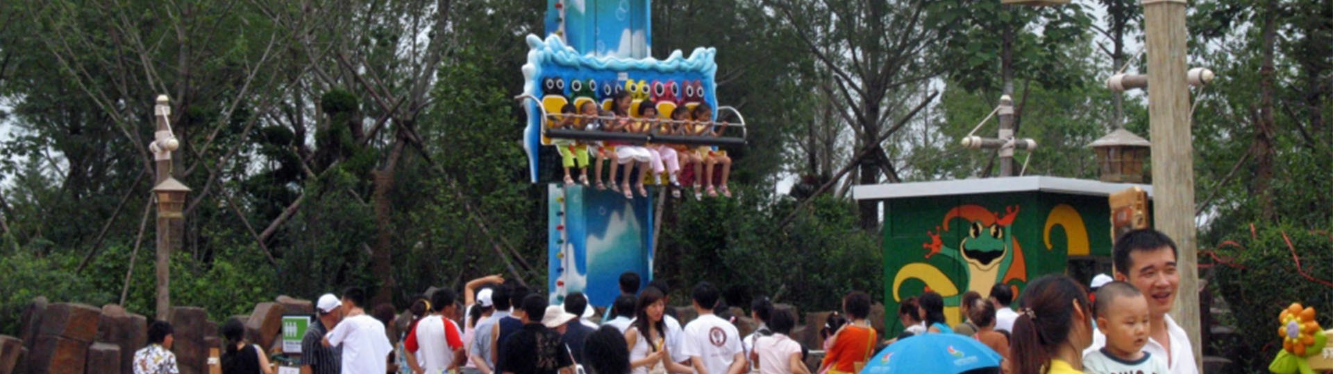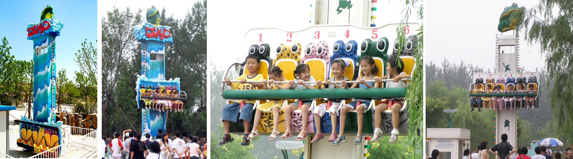 青蛙造型逼真的座艙伴隨著蛙鳴叫聲的背景音樂,沿著垂直軌道上下往復連貫跳躍運動,幅度有大有小,令游客感受空間飛行跳躍的樂趣。