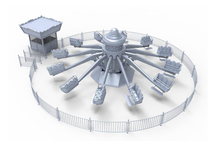 彈跳機(jī)中軸為中心帶動周圍十二個(gè)座艙繞豎直中軸旋轉(zhuǎn),同時(shí)座艙伴隨著音樂進(jìn)行高低、快慢不同的跳躍式運(yùn)動。使乘客在游玩過程中體驗(yàn)到旋轉(zhuǎn)加跳躍的樂趣。