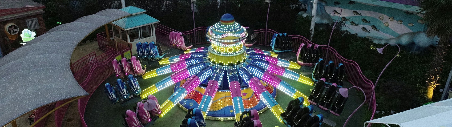 彈跳機中軸為中心帶動周圍十四個座艙繞豎直中軸旋轉(zhuǎn),同時座艙伴隨著音樂進行高低、快慢不同的跳躍式運動。使乘客在過程中體驗到旋轉(zhuǎn)加跳躍的樂趣。