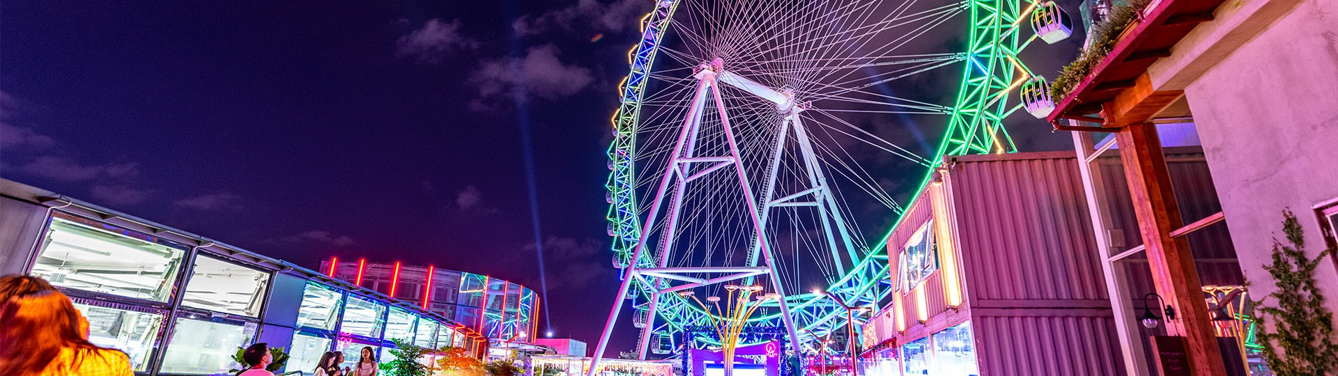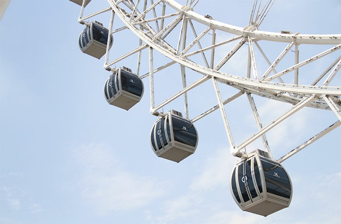 62米觀覽車,塔架由6根立柱構(gòu)成,轉(zhuǎn)盤為輻條式,轉(zhuǎn)盤上均勻分布著36個(gè)吊廂。吊廂運(yùn)作時(shí)配以明麗變幻的燈飾,搭配別具匠心的現(xiàn)場(chǎng)配景,以及柔美動(dòng)聽的背景音樂(lè),乘客在吊箱內(nèi)平穩(wěn)悠閑地縱覽周邊美景。
