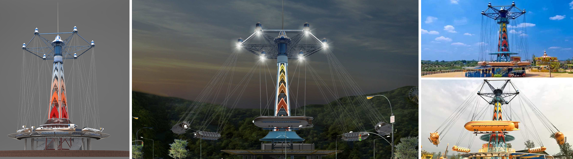 幻速追影六個(gè)飛機(jī)吊掛座艙隨同旋轉(zhuǎn)架相對(duì)塔體自由旋轉(zhuǎn)并外擺升起,繞中心立柱飛行,科幻又刺激。夜間智能燈光系統(tǒng)亮起,成為樂(lè)園一道的奇趣風(fēng)景線。