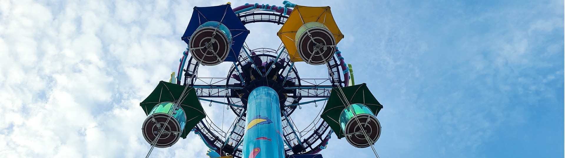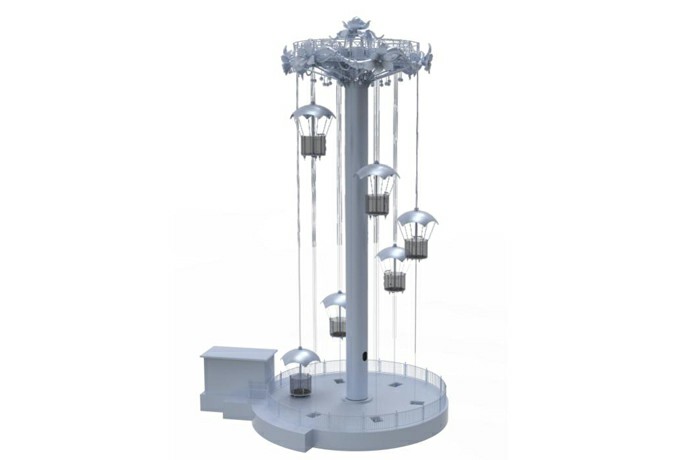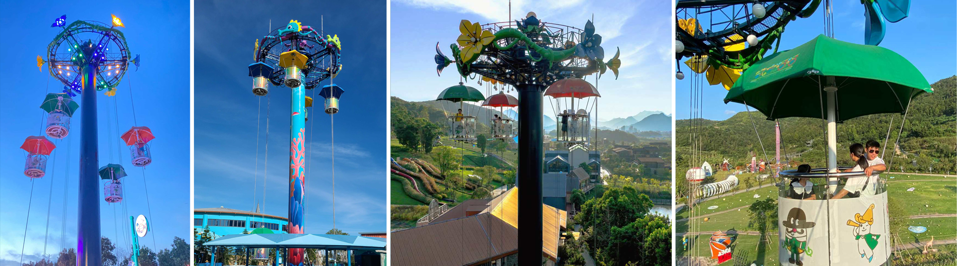 跳傘塔是一項(xiàng)使乘客吊籃沿豎直方向做上下往復(fù)運(yùn)動(dòng)的設(shè)備。外觀猶 如打開的傘體,絢爛多彩,使乘客在吊籃內(nèi)愜意欣賞周邊風(fēng)景。