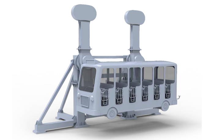 瘋狂巴士配備雙向可逆無級(jí)自動(dòng)調(diào)速系統(tǒng),經(jīng)過減速、分速等一系列機(jī)構(gòu),實(shí)現(xiàn)一臺(tái)電機(jī)帶動(dòng)兩個(gè)驅(qū)動(dòng)臂的擺動(dòng),帶動(dòng)巴士的平動(dòng),巴士在電氣系統(tǒng)的控制下可以實(shí)現(xiàn)正反兩種通過最高點(diǎn)的運(yùn)動(dòng),給乘客以歡樂搖擺的體驗(yàn)。