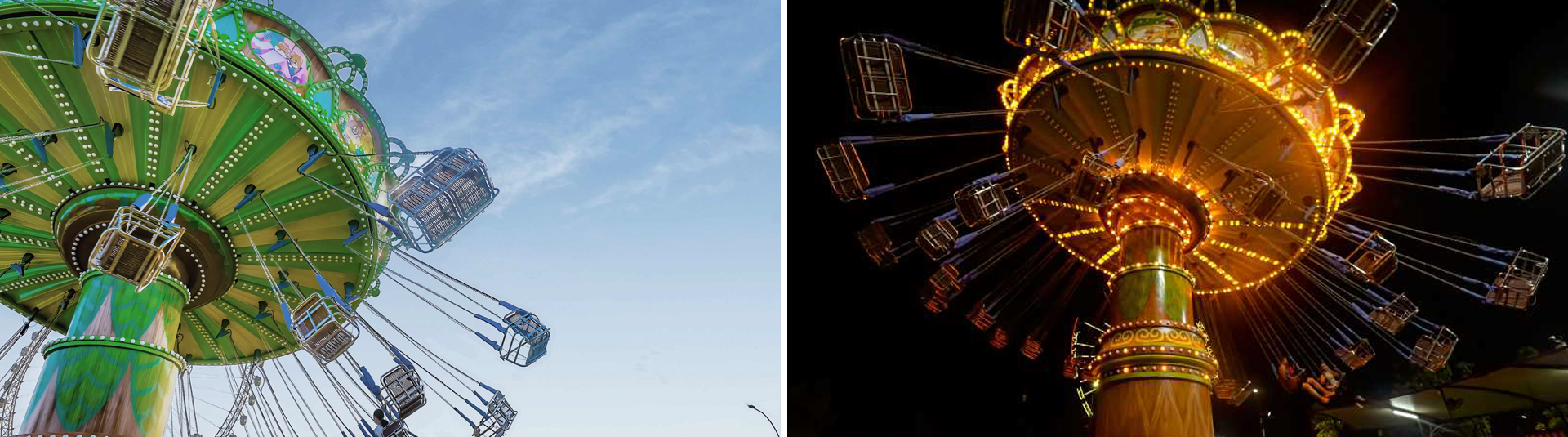 颶風飛椅設備通過傘形轉盤的旋轉和中間轉臺的錯位旋轉,實現(xiàn)飛椅的波浪式運動,乘客猶如在空中自由飛翔飄蕩。此款飛椅設有2人座艙,適合家庭親?或情侶游客游玩。