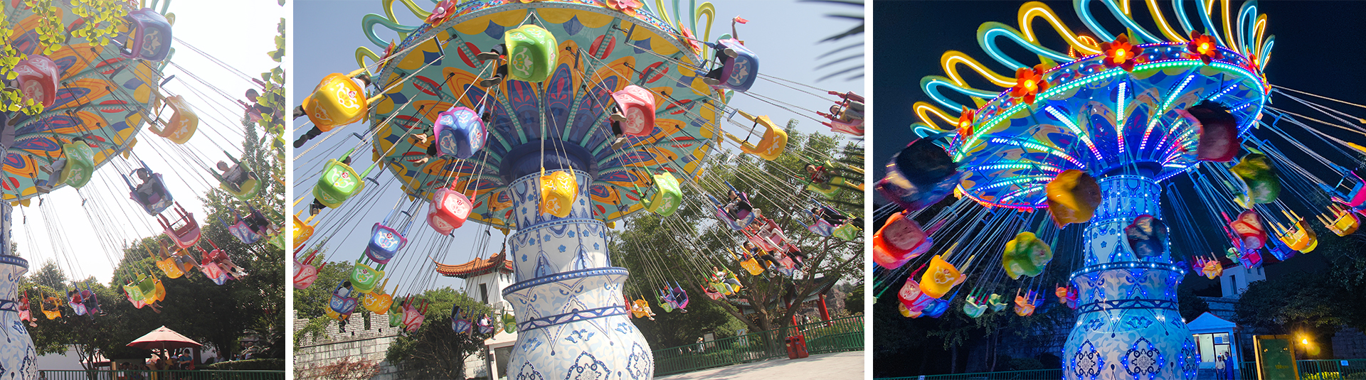 颶風(fēng)飛椅設(shè)備通過傘形轉(zhuǎn)盤的旋轉(zhuǎn)和中間轉(zhuǎn)臺的錯位旋轉(zhuǎn),實現(xiàn)飛椅的波浪式運動,乘客猶如在空中自由飛翔飄蕩。
