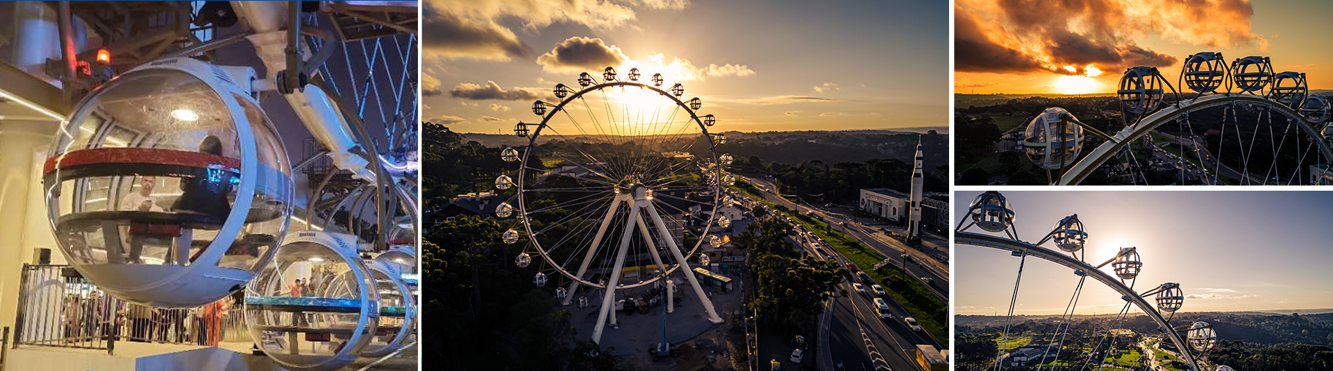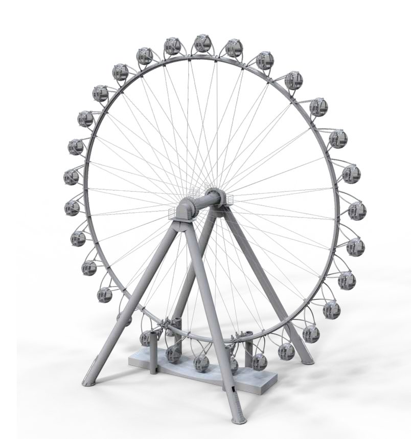 觀覽?塔架采?新穎的4?柱?橫梁極簡(jiǎn)結(jié)構(gòu),搭配單管輻條式轉(zhuǎn)盤和圓球艙,整體姿態(tài)盡顯現(xiàn)代簡(jiǎn)約之美。觀覽??轉(zhuǎn)盤上均勻分布著30個(gè)?珠般的圓球吊廂,單管輻條式設(shè)計(jì)令艙內(nèi)觀景視野開(kāi)闊通透,可供180?觀光。在夜間滿環(huán)律動(dòng)的燈光能瞬間點(diǎn)燃夜場(chǎng)?氛推?觀覽激情。