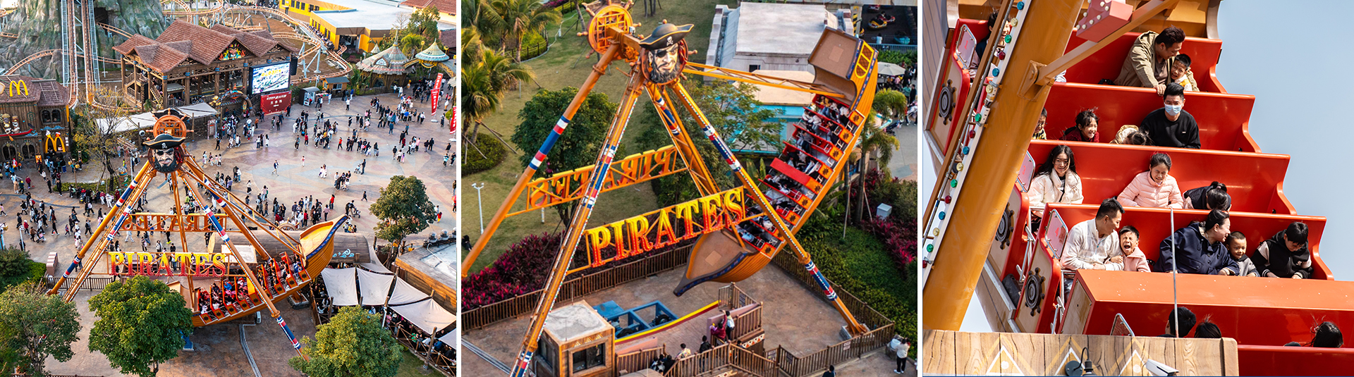 海盜船繞?平軸來回擺動,模擬海盜乘?出海的場景,交替??的失重和超重感讓乘客盡情體驗搖擺的樂趣。
