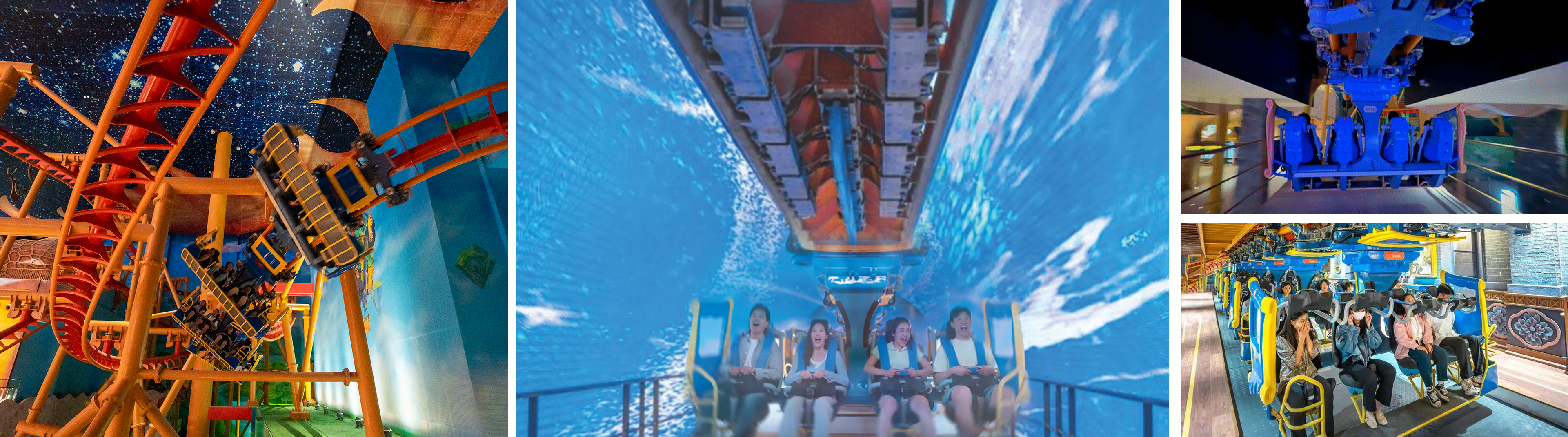 自帶動力的懸掛式過山車實現(xiàn)了在軌道任意位置變換速度,時速可高達 32km/h,在高清電影、科技特效的影視相融合下,使乘客完全沉浸在游戲的樂趣和刺激中。