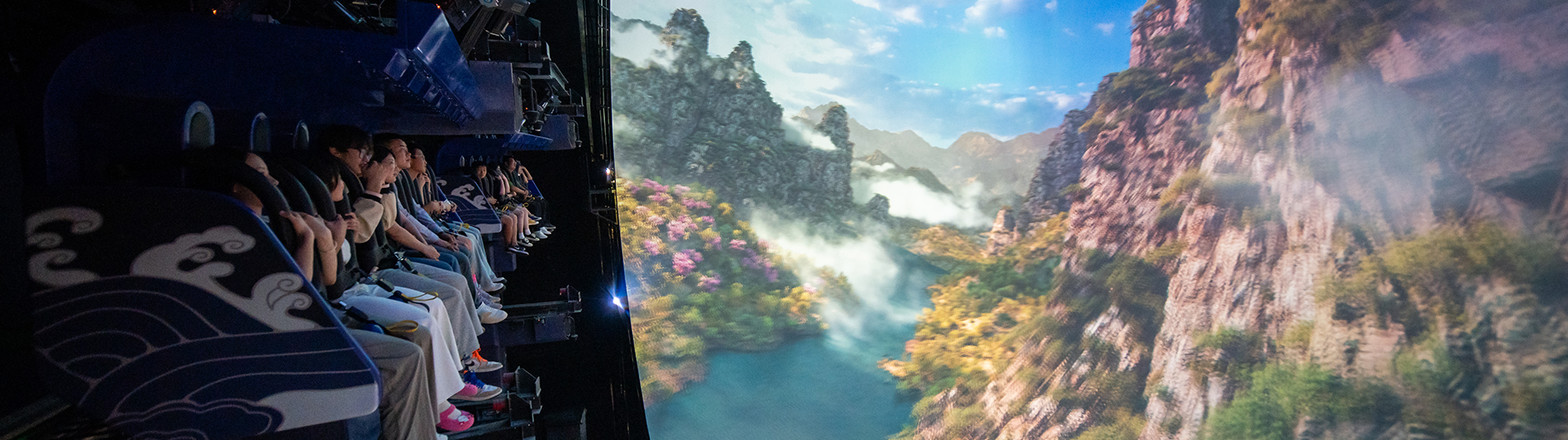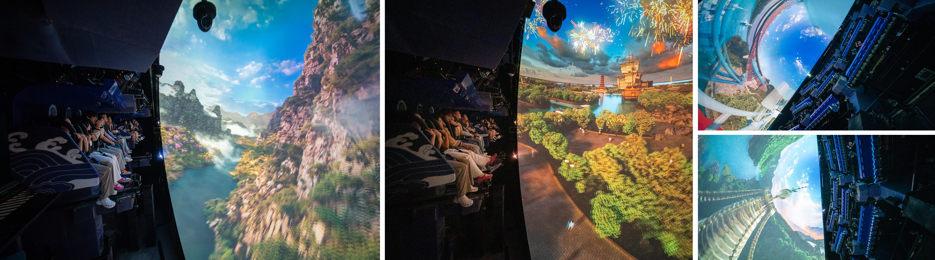 平推式飛行影院采用獨(dú)特的六自由度懸掛式動(dòng)感座椅,逼真模擬墜落、爬升、轉(zhuǎn)彎等動(dòng)作,與巨型大球幕影片內(nèi)容配合,產(chǎn)生身臨其境的全景式包圍的真實(shí)飛行,給游客帶來(lái)一場(chǎng)翱翔于空中的強(qiáng)烈沉浸式體驗(yàn)。