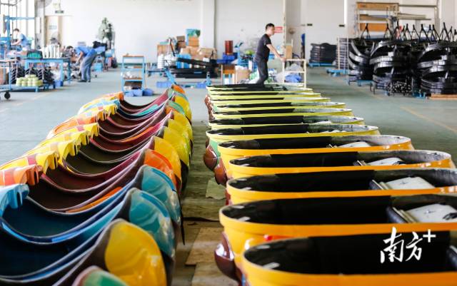 在金馬游樂港口鎮(zhèn)廠區(qū)的生產(chǎn)車間內(nèi),一些制作完成的碰碰車外殼碼放整齊,等待出庫?;厮葸^去30余年,這個小小的游藝車里承載了“金馬”的創(chuàng)業(yè)史。