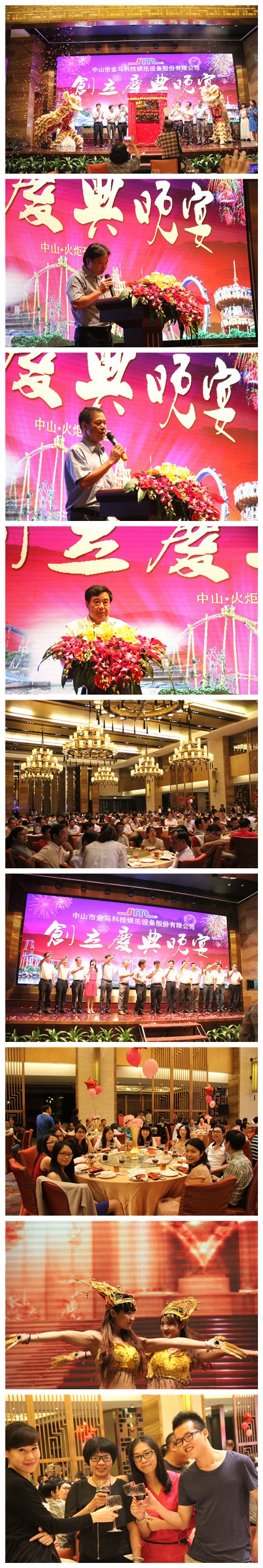晚上19時,在一片喜慶熱烈的龍獅舞動中,慶典活動正式拉開帷幕。首先由鄧志毅董事長上臺致辭,他深情答謝各界人士的鼎力支持及金馬人的拼搏奮斗,并滿懷激情鼓舞公司上下攜手共進,以產(chǎn)品創(chuàng)新、管理創(chuàng)新、經(jīng)營創(chuàng)新共筑金馬游樂王國夢!隨后,火炬開發(fā)區(qū)管委會總經(jīng)濟師梁紹華先生發(fā)表致辭,他對金馬落戶火炬所起的龍頭帶動作用表示高度認可,并對公司未來發(fā)展寄予厚望。緊接著,原政協(xié)副主席、金馬游藝創(chuàng)始領導李武彪先生上臺講話,他為現(xiàn)場觀眾娓娓道來金馬走過來的發(fā)展路,并寄語金馬以創(chuàng)新引領中國文化裝備制造位居世界前列。此后,慶典活動進入最激動人心的時刻——中山市金馬科技娛樂設備股份有限公司揭牌儀式!在到場的領導、嘉賓及金馬人的見證下,各轄區(qū)領導、李主席及鄧總共同手攜紅線,帷布徐徐拉開,金馬股份公司正式揭牌!在龍獅獻瑞、鑼鼓祥鳴中,大家都送去了激動、祝賀的掌聲,祝愿金馬加快與資本市場對接,早日上市實現(xiàn)金馬游樂王國夢!在隨后的祝酒環(huán)節(jié)中,鄧總領銜公司高管、老領導上臺,祝愿到場領導、嘉賓、金馬人步步高升、萬事如意,祝愿金馬事業(yè)興旺騰飛!在《好日子》的樂聲中,晚宴正式開始,現(xiàn)場好不熱鬧,臺上舞蹈翩躚、鼓舞飛揚,臺下暢懷歡聚、喜逐眉梢,與會人員度過了一個美好的夜晚。